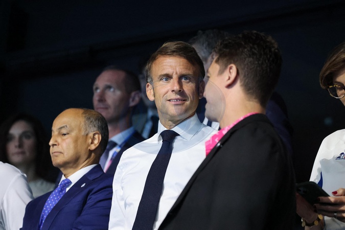 xclusif - Prix Spécial - No Web - Emmanuel Macron assiste aux épreuves de natation lors des Jeux Olympiques de Paris2024 (JO)