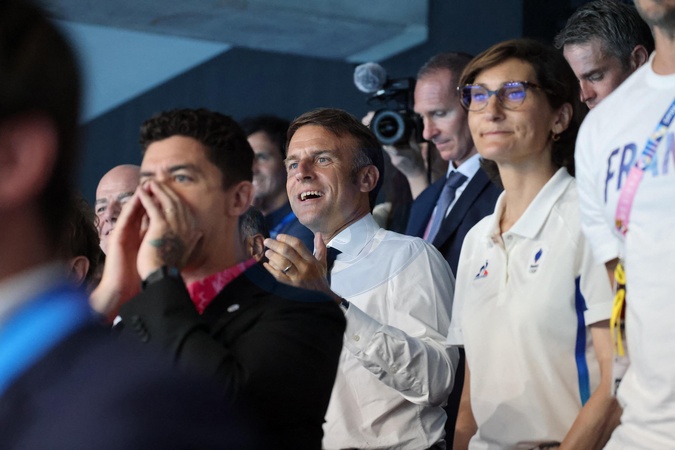 Exclusif - Prix Spécial - No Web - Emmanuel Macron assiste aux épreuves de natation lors des Jeux Olympiques de Paris2024 (JO) le 2 aout 2024. © Dominique Jacovides-Pierre Perusseau/Bestimage Exclusive - For Germany call for price - Emmanuel Macron attends the swimming events during the Paris 2024 Olympic Games (Olympics) on August 2, 2024.