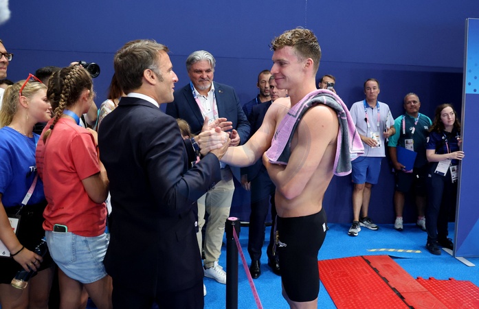 xclusif - Prix Spécial - No Web - Emmanuel Macron assiste aux épreuves de natation lors des Jeux Olympiques de Paris2024 (JO)