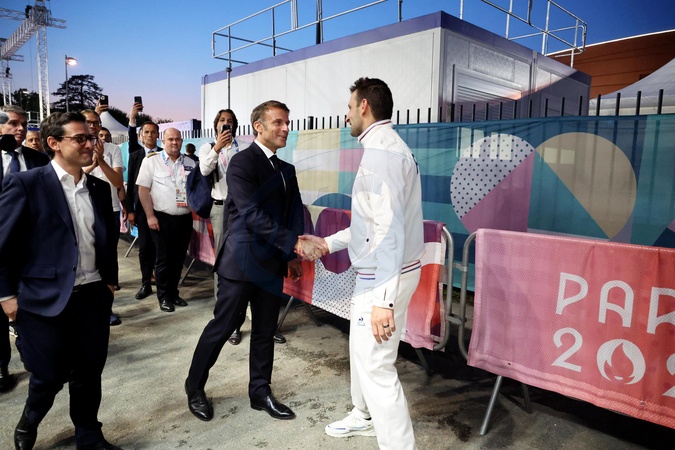 Exclusif - Prix Spécial - No Web - Emmanuel Macron et Joris Daudet médaille d'or en BMX racing - Emmanuel Macron assiste aux épreuves de BMX à Saint-Quentin-en- Yvelines lors des Jeux Olympiques de Paris2024 (JO) le 2 Aout 2024. © Dominique Jacovides-Pierre Perusseau/Bestimage Exclusive - For Germany call for price - mmanuel Macron attends the BMX events in Saint-Quentin-en-Yvelines during the Paris2024 Olympic Games (JO) on August 2, 2024. © Dominique Jacovides-Pierre Perusseau/Bestimage