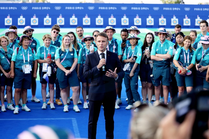 Exclusif - Prix Spécial - No Web - Emmanuel Macron est allé à la rencontre des volontaires du Champs de Mars lors des Jeux Olympiques de Paris2024 (JO) le 2 aout 2024. © Dominique Jacovides-Pierre Perusseau/Bestimage Exclusive - For Germany call for price - Emmanuel Macron went to meet the volunteers of the Champs de Mars during the Paris 2024 Olympic Games (JO) on August 2, 2024