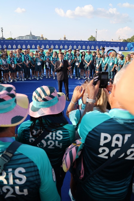 Exclusif - Prix Spécial - No Web - Emmanuel Macron est allé à la rencontre des volontaires du Champs de Mars lors des Jeux Olympiques de Paris2024 (JO)