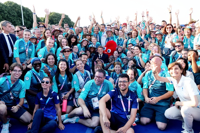 Exclusif - Prix Spécial - No Web - Emmanuel Macron est allé à la rencontre des volontaires du Champs de Mars lors des Jeux Olympiques de Paris2024 (JO)