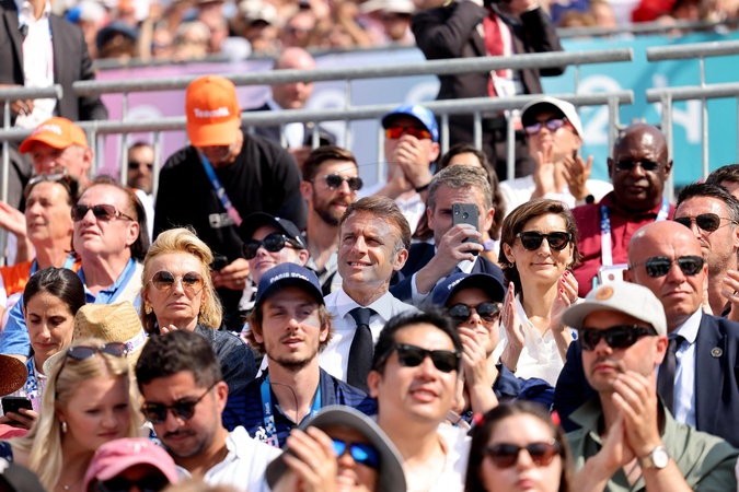 Exclusif - Prix Spécial - No Web - - Emmanuel Macron assiste aux épreuves de beach-volley lors des Jeux Olympiques de Paris2024 (JO) le 2 aout 2024. © Dominique Jacovides-Pierre Perusseau/Bestimage Exclusive - For Germany call for price - Emmanuel Macron attends the beach volleyball events during the Paris 2024 Olympic Games (Olympics) on August 2, 2024.