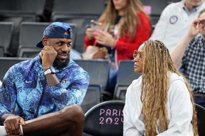 LeBron James et sa femme Savannah lors de la victoire des Etats-Unis sur le Nigeria (88-74) pour les quarts de finale du tournoi de basket féminin lors des Jeux Olympiques de Paris 2024 (JO) , à l'Arena Bercy à Paris, France, le 7 août 2024. © Jacovides-Perusseau/Bestimage Personalities at the USA / Nigeria women's basketball match during the Paris 2024 Olympic Games on august 7th 2024