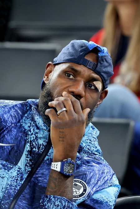 LeBron James lors de la victoire des Etats-Unis sur le Nigeria (88-74) pour les quarts de finale du tournoi de basket féminin lors des Jeux Olympiques de Paris 2024 (JO) , à l'Arena Bercy à Paris, France, le 7 août 2024. © Jacovides-Perusseau/Bestimage Personalities at the USA / Nigeria women's basketball match during the Paris 2024 Olympic Games on august 7th 2024