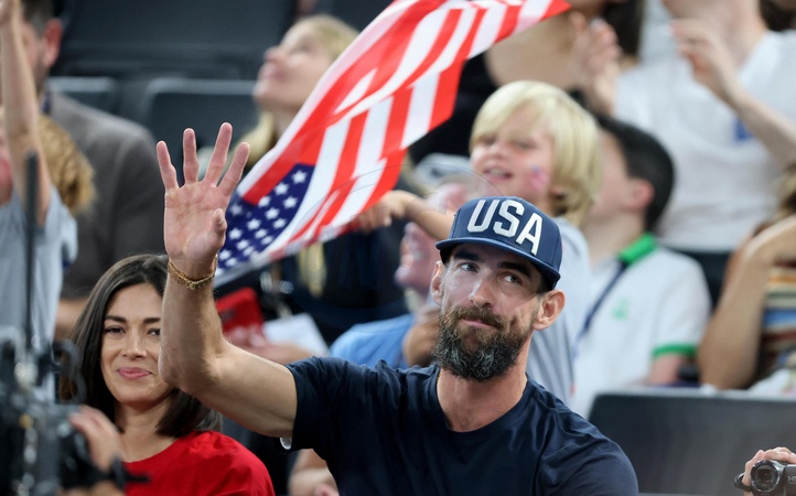 Michael Phelps et sa femme Nicole lors de la victoire des Etats-Unis sur le Nigeria (88-74) pour les quarts de finale du tournoi de basket féminin lors des Jeux Olympiques de Paris 2024 (JO) , à l'Arena Bercy à Paris, France, le 7 août 2024. © Jacovides-Perusseau/Bestimage Personalities at the USA / Nigeria women's basketball match during the Paris 2024 Olympic Games on august 7th 2024