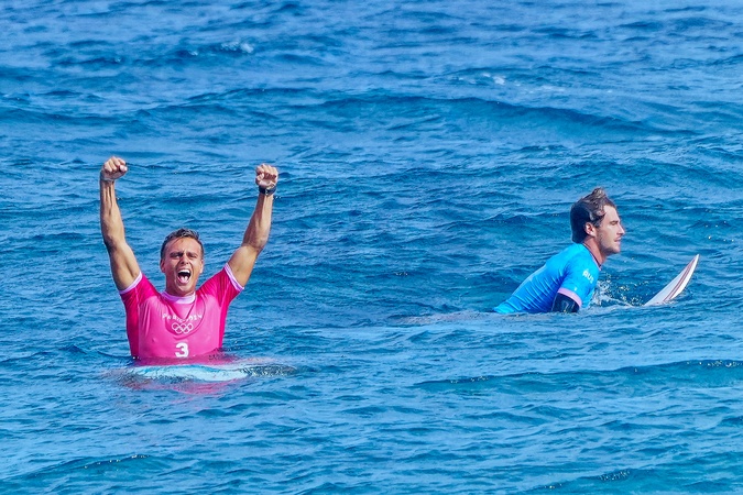 Epreuve de surf et podium lors des Jeux Olympiques de Paris 2024 (JO) à Teahupoo, Tahiti