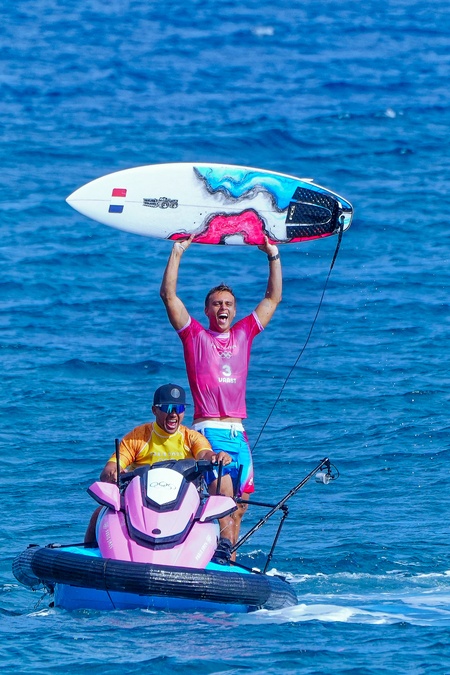 Kauli Vaast - médaille d'or - Epreuve de surf lors des Jeux Olympiques de Paris 2024 (JO) à Teahupoo, Tahiti, le 5 août 2024. © Bestimage Surfing event during the Paris 2024 Olympic Games (Olympics) in Teahupoo, Tahiti, on August 5, 2024.