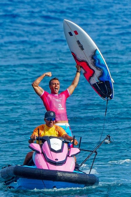 Epreuve de surf et podium lors des Jeux Olympiques de Paris 2024 (JO) à Teahupoo, Tahiti