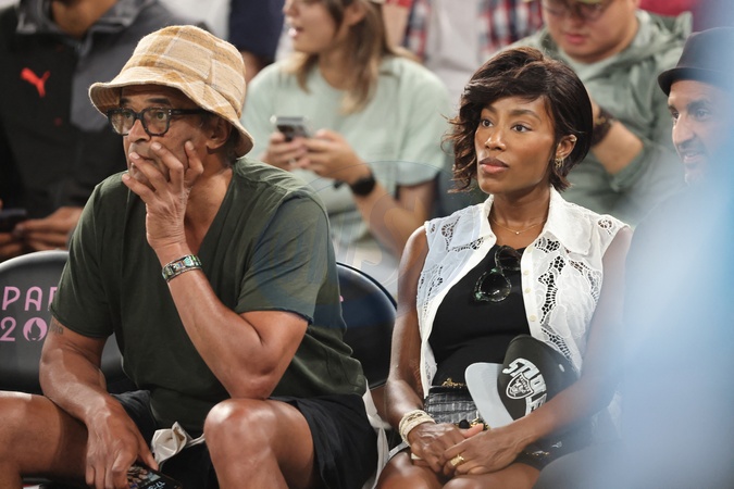 Yannick Noah et sa compagne Malika - Les célébrités en tribunes pendant l'épreuve de basketball de Demi-Finale opposant la France à l'Allemagne lors des Jeux Olympiques de Paris 2024 (JO) à l'Arena Bercy, à Paris, France, le 8 août 2024. © Jacovides-Perusseau/Bestimage Celebrities in the stands during the Semi-Final basketball match between France and Germany during the Paris 2024 Olympic Games (Olympics) at the Arena Bercy in Paris, France, August 8, 2024.