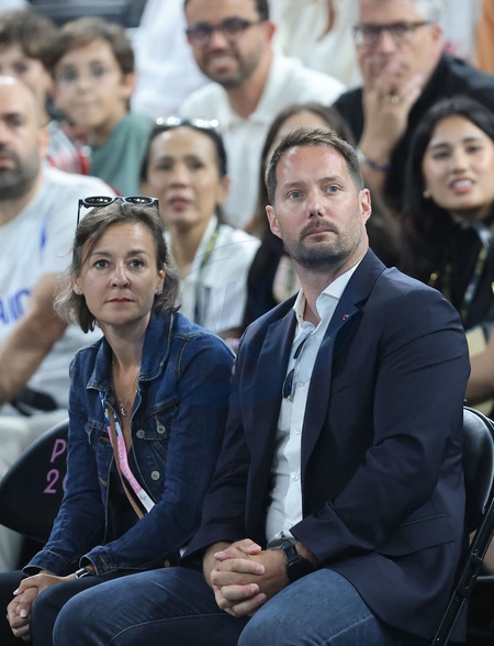 Gwiazdy na trybunach podczas półfinałowego turnieju koszykówki pomiędzy Francją a Niemcami podczas Igrzysk Olimpijskich w Paryżu w 2024 r. (OG) w Bercy Arena.