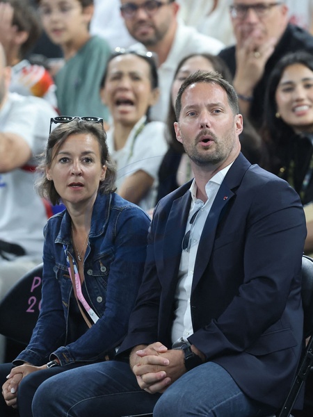 Les célébrités en tribunes pendant l'épreuve de basketball de Demi-Finale opposant la France à l'Allemagne lors des Jeux Olympiques de Paris 2024 (JO) à l'Arena Bercy