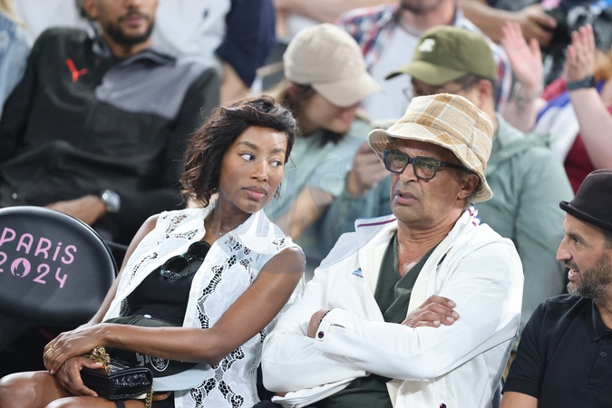 Yannick Noah et sa compagne Malika - Les célébrités en tribunes pendant l'épreuve de basketball de Demi-Finale opposant la France à l'Allemagne lors des Jeux Olympiques de Paris 2024 (JO) à l'Arena Bercy, à Paris, France, le 8 août 2024. © Jacovides-Perusseau/Bestimage Celebrities in the stands during the Semi-Final basketball match between France and Germany during the Paris 2024 Olympic Games (Olympics) at the Arena Bercy in Paris, France, August 8, 2024.