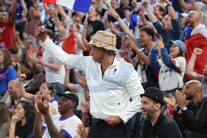 Gwiazdy na trybunach podczas półfinałowego meczu koszykówki pomiędzy Francją a Niemcami podczas Igrzysk Olimpijskich w Paryżu w 2024 r. (OG) w Arenie Bercy