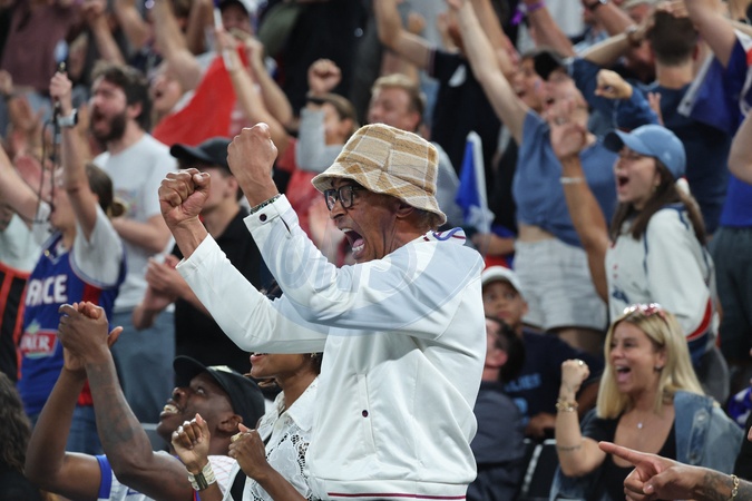 Gwiazdy na trybunach podczas półfinałowego meczu koszykówki pomiędzy Francją a Niemcami podczas Igrzysk Olimpijskich w Paryżu w 2024 r. (OG) w Arenie Bercy