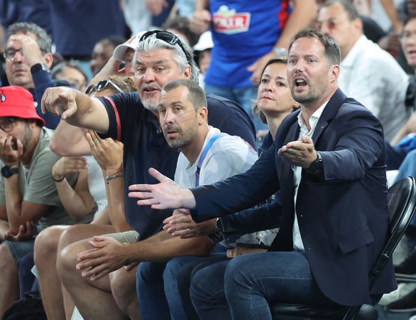 Gwiazdy na trybunach podczas półfinałowego meczu koszykówki pomiędzy Francją a Niemcami podczas Igrzysk Olimpijskich w Paryżu w 2024 r. (OG) w Arenie Bercy