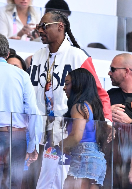 Snoop Dogg et Simone Biles - Les célébrités assistent aux épreuves d'athlétisme lors des Jeux Olympiques de Paris2024 (JO), le 8 août 2024. © Perusseau-Jacovides / Bestimage Celebrities attend the athletics events during the Paris 2024 Olympic Games (Olympics) on August 8, 2024.