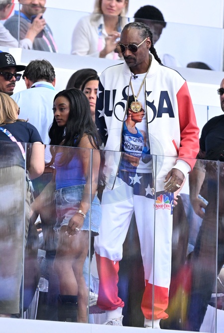 Snoop Dogg et Simone Biles - Les célébrités assistent aux épreuves d'athlétisme lors des Jeux Olympiques de Paris2024 (JO), le 8 août 2024. © Perusseau-Jacovides / Bestimage Celebrities attend the athletics events during the Paris 2024 Olympic Games (Olympics) on August 8, 2024.