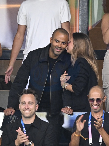 Tony Parker et sa nouvelle compagne Agathe Teyssier lors de la finale qui oppose la France à l'Espagne pour les Jeux Olympiques au Parc des Princes à Paris, le 9 aout 2024. © Jacovides-Perusseau/Bestimage Celebrities during the final football match between France and Spain during the Paris 2024 Olympic Games (Olympics) at the Parc des Princes in Paris, France, August 9, 2024.