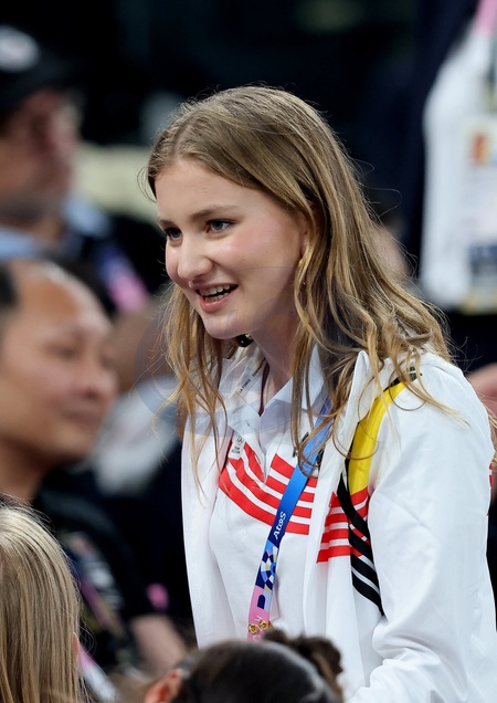 Princesse Elisabeth de Belgique en tribunes pendant l'épreuve de basketball féminin Demi-Finale opposant la France à la Belgique (81-75) lors des Jeux Olympiques de Paris 2024 (JO) à l'Arena Bercy, à Paris, France, le 9 août 2024. © Jacovides-Perusseau/Bestimage Celebs in the stands during the women's basketball Semi-Final between the France and Belgium (81-75) during the Paris 2024 Olympic Games (Olympics) at the Arena Bercy, in Paris, France, on August 9, 2024.