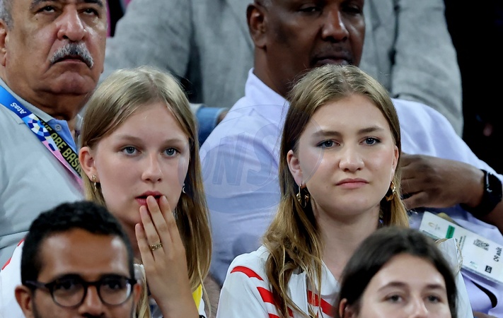 Princesse Eléonore de Belgique, Princesse Elisabeth de Belgique en tribunes pendant l'épreuve de basketball féminin Demi-Finale opposant la France à la Belgique (81-75) lors des Jeux Olympiques de Paris 2024 (JO) à l'Arena Bercy, à Paris, France, le 9 août 2024. © Jacovides-Perusseau/Bestimage Celebs in the stands during the women's basketball Semi-Final between the France and Belgium (81-75) during the Paris 2024 Olympic Games (Olympics) at the Arena Bercy, in Paris, France, on August 9, 2024.