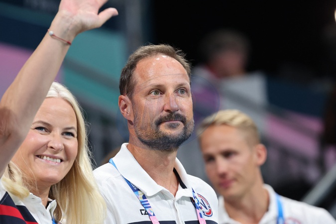 Książę Haakon i księżna Mette-Marit z Norwegii podczas finału piłki ręcznej kobiet pomiędzy Francją a Norwegią (21-29) podczas Igrzysk Olimpijskich Paryż 2024