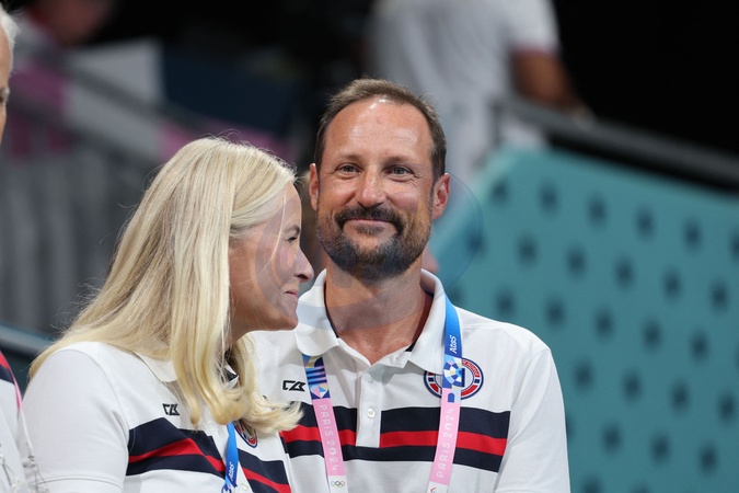 Książę Haakon i księżna Mette-Marit z Norwegii podczas finału piłki ręcznej kobiet pomiędzy Francją a Norwegią (21-29) podczas Igrzysk Olimpijskich Paryż 2024