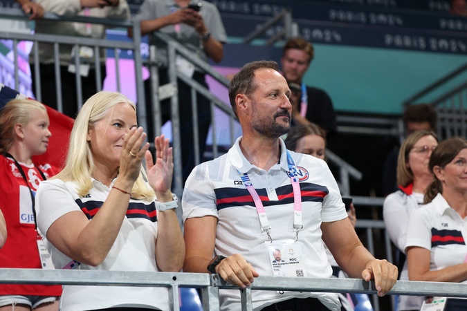 Książę Haakon i księżna Mette-Marit z Norwegii podczas finału piłki ręcznej kobiet pomiędzy Francją a Norwegią (21-29) podczas Igrzysk Olimpijskich Paryż 2024