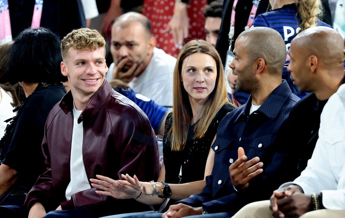 Léon Marchand, Manon Apithy-Brunet, Tony Parker, Thierry Henry - Les célébrités en tribunes pendant la finale de basketball opposant les Etats-Unis à la France (98-87) lors des Jeux Olympiques de Paris 2024 (JO) à l'Arena Bercy, à Paris, France, le 10 août 2024. © Jacovides-Perusseau/Bestimage Celebrities in the stands during the Final basketball match between US and France during the Paris 2024 Olympic Games (Olympics) at the Arena Bercy in Paris, France, August 10, 2024.