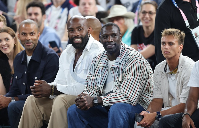 Manon Apithy-Brunet, Tony Parker, Thierry Henry, Teddy Riner, Omar Sy, Kauli Vaast - Les célébrités en tribunes pendant la finale de basketball opposant les Etats-Unis à la France (98-87) lors des Jeux Olympiques de Paris 2024 (JO) à l'Arena Bercy, à Paris, France, le 10 août 2024. © Jacovides-Perusseau/Bestimage Celebrities in the stands during the Final basketball match between US and France during the Paris 2024 Olympic Games (Olympics) at the Arena Bercy in Paris, France, August 10, 2024.
