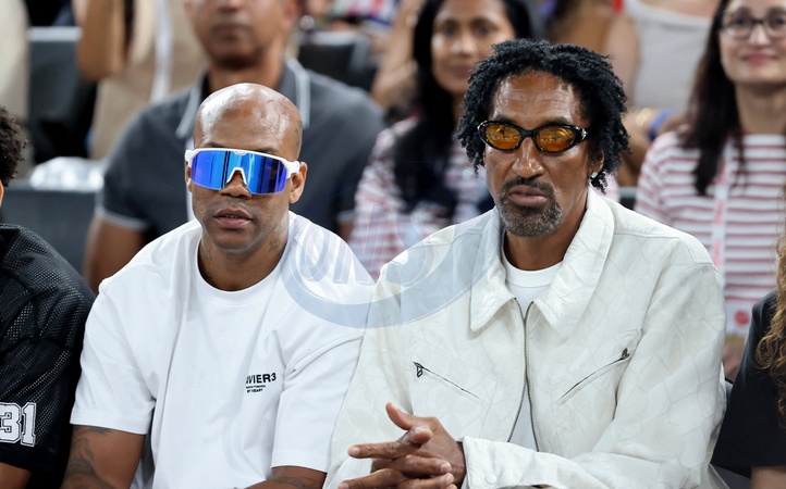 Stephon Marbury et Scottie Pippen - Les célébrités en tribunes pendant la finale de basketball opposant les Etats-Unis à la France (98-87) lors des Jeux Olympiques de Paris 2024 (JO) à l'Arena Bercy, à Paris, France, le 10 août 2024. © Jacovides-Perusseau/Bestimage Celebrities in the stands during the Final basketball match between US and France during the Paris 2024 Olympic Games (Olympics) at the Arena Bercy in Paris, France, August 10, 2024.
