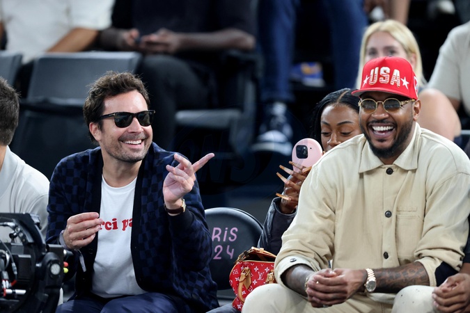 Jimmy Fallon, Carmelo Anthony - Les célébrités en tribunes pendant la finale de basketball opposant les Etats-Unis à la France (98-87) lors des Jeux Olympiques de Paris 2024 (JO) à l'Arena Bercy, à Paris, France, le 10 août 2024. © Jacovides-Perusseau/Bestimage Celebrities in the stands during the Final basketball match between US and France during the Paris 2024 Olympic Games (Olympics) at the Arena Bercy in Paris, France, August 10, 2024.