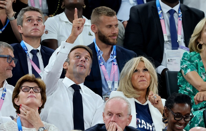 Emmanuel Macron et Brigitte Macron - Les célébrités en tribunes pendant la finale de basketball opposant les Etats-Unis à la France (98-87) lors des Jeux Olympiques de Paris 2024 (JO) à l'Arena Bercy, à Paris, France, le 10 août 2024. © Jacovides-Perusseau/Bestimage Celebrities in the stands during the Final basketball match between US and France during the Paris 2024 Olympic Games (Olympics) at the Arena Bercy in Paris, France, August 10, 2024.