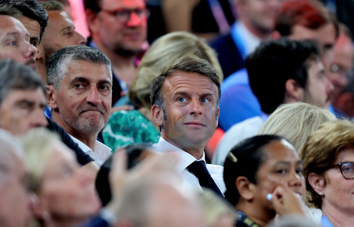 Emmanuel Macron - Les célébrités en tribunes pendant la finale de basketball opposant les Etats-Unis à la France (98-87) lors des Jeux Olympiques de Paris 2024 (JO) à l'Arena Bercy, à Paris, France, le 10 août 2024. © Jacovides-Perusseau/Bestimage Celebrities in the stands during the Final basketball match between US and France during the Paris 2024 Olympic Games (Olympics) at the Arena Bercy in Paris, France, August 10, 2024.