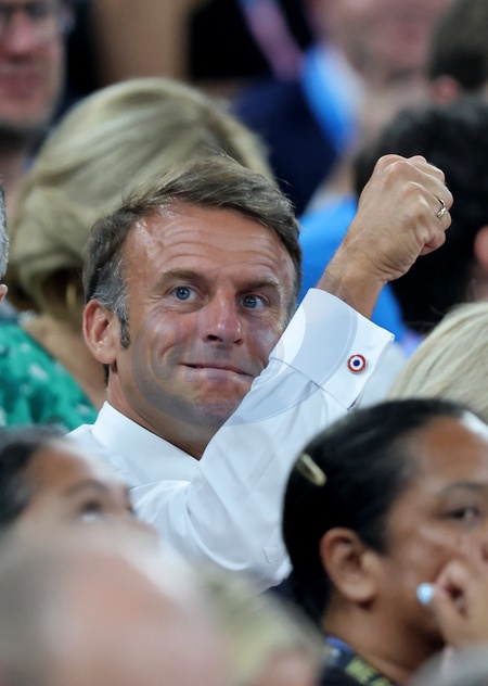 Emmanuel Macron - Les célébrités en tribunes pendant la finale de basketball opposant les Etats-Unis à la France (98-87) lors des Jeux Olympiques de Paris 2024 (JO) à l'Arena Bercy, à Paris, France, le 10 août 2024. © Jacovides-Perusseau/Bestimage Celebrities in the stands during the Final basketball match between US and France during the Paris 2024 Olympic Games (Olympics) at the Arena Bercy in Paris, France, August 10, 2024.