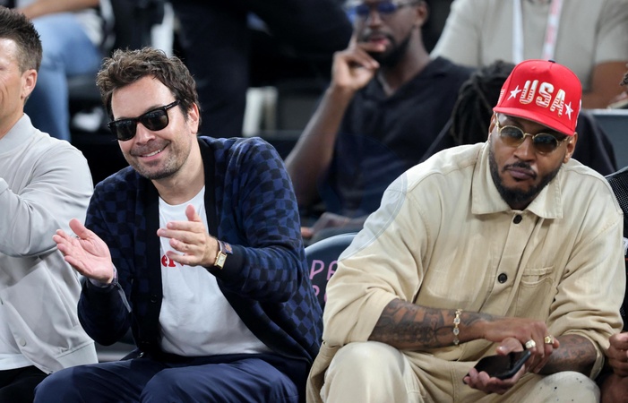 Jimmy Fallon et Carmelo Anthony - Les célébrités en tribunes pendant la finale de basketball opposant les Etats-Unis à la France (98-87) lors des Jeux Olympiques de Paris 2024 (JO) à l'Arena Bercy, à Paris, France, le 10 août 2024. © Jacovides-Perusseau/Bestimage Celebrities in the stands during the Final basketball match between US and France during the Paris 2024 Olympic Games (Olympics) at the Arena Bercy in Paris, France, August 10, 2024.