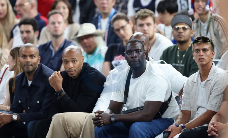 Tony Parker, Thierry Henry, Teddy Riner, Omar Sy, Kauli Vaast - Les célébrités en tribunes pendant la finale de basketball opposant les Etats-Unis à la France (98-87) lors des Jeux Olympiques de Paris 2024 (JO) à l'Arena Bercy, à Paris, France, le 10 août 2024. © Jacovides-Perusseau/Bestimage Celebrities in the stands during the Final basketball match between US and France during the Paris 2024 Olympic Games (Olympics) at the Arena Bercy in Paris, France, August 10, 2024.