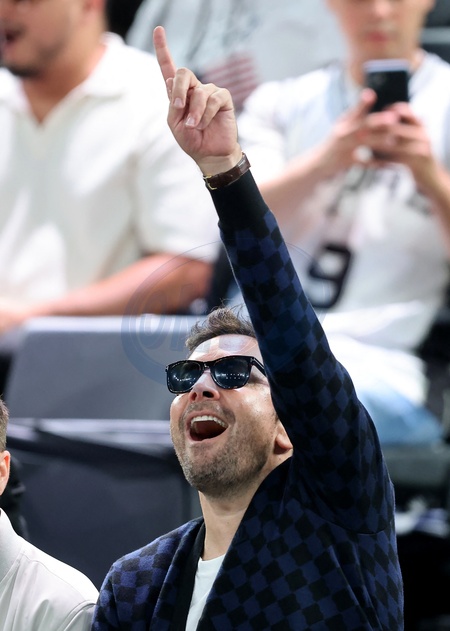 Gwiazdy na trybunach finałowego meczu koszykówki mężczyzn między Stanami Zjednoczonymi a Francją (98–87) podczas Igrzysk Olimpijskich w Paryżu w 2024 r.