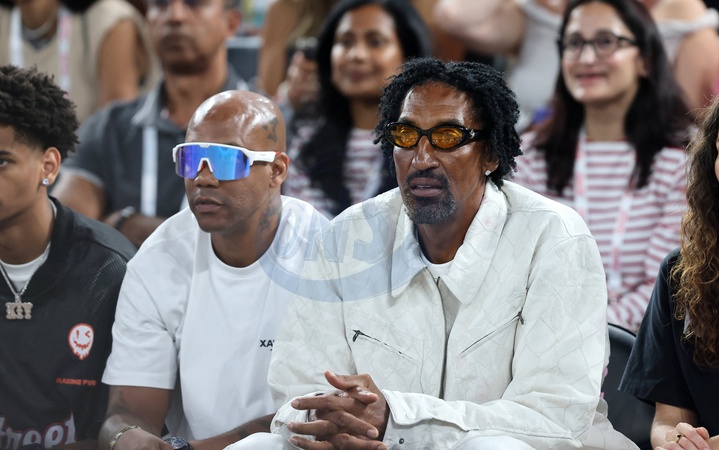 Stephon Marbury et Scottie Pippen - Les célébrités en tribunes pendant la finale de basketball opposant les Etats-Unis à la France (98-87) lors des Jeux Olympiques de Paris 2024 (JO) à l'Arena Bercy, à Paris, France, le 10 août 2024. © Jacovides-Perusseau/Bestimage Celebrities in the stands during the Final basketball match between US and France during the Paris 2024 Olympic Games (Olympics) at the Arena Bercy in Paris, France, August 10, 2024.