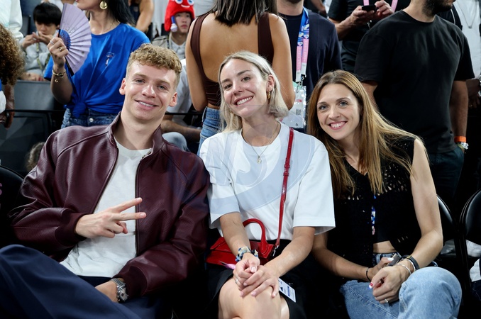 Léon Marchand, Cassandre Beaugrand, Manon Apithy-Brunet - Les célébrités en tribunes pendant la finale de basketball opposant les Etats-Unis à la France (98-87) lors des Jeux Olympiques de Paris 2024 (JO) à l'Arena Bercy, à Paris, France, le 10 août 2024. © Jacovides-Perusseau/Bestimage Celebrities in the stands during the Final basketball match between US and France during the Paris 2024 Olympic Games (Olympics) at the Arena Bercy in Paris, France, August 10, 2024.