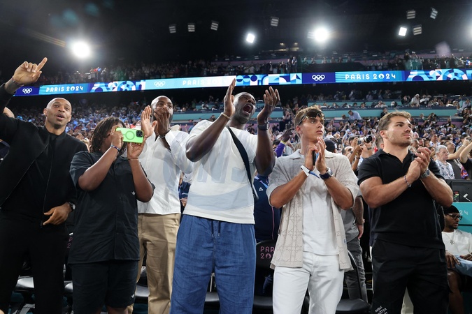Gwiazdy na trybunach finałowego meczu koszykówki mężczyzn między Stanami Zjednoczonymi a Francją (98–87) podczas Igrzysk Olimpijskich w Paryżu w 2024 r.