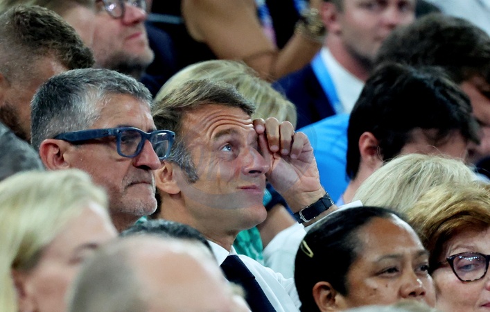Emmanuel Macron - Les célébrités en tribunes pendant la finale de basketball opposant les Etats-Unis à la France (98-87) lors des Jeux Olympiques de Paris 2024 (JO) à l'Arena Bercy, à Paris, France, le 10 août 2024. © Jacovides-Perusseau/Bestimage Celebrities in the stands during the Final basketball match between US and France during the Paris 2024 Olympic Games (Olympics) at the Arena Bercy in Paris, France, August 10, 2024.