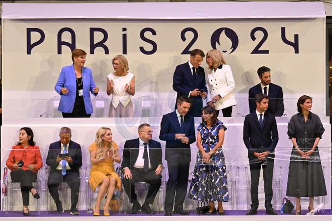 Thomas Bach, président du CIO, Le président de la République française Emmanuel Macron, la première dame Brigitte Macron, Tony Estanguet, Anne Hidalgo, maire de Paris, Gabriel Attal, Amélie Oudéa-Castera aux côtés de membres du Comité international olympique - Cérémonie de clôture des Jeux Olympiques de Paris 2024 au stade de France à Saint-Denis, le 11 août 2024. 270 artistes, 8200 athlètes et accompagnants issus de 205 délégations se succèdent dans le stade, devant 72.0000 spectateurs, avec la cycliste française P.Ferrand-Prévot et le joueur de rugby français, A.Dupont comme porte-drapeau pour la France. Comme pour la cérémonie d'ouverture, la direction artistique de cet événement est signée, T.Jolly. Au programme de cette soirée, cérémonie des médailles, discours et extinction de la flamme olympique, le show artistique baptisé «Records», les groupes Air et Phoenix pour la partie musicale tandis que l'acteur américain T.Cruise participe à cet événement. K.Bass, maire de Los Angeles, reçoit le drapeau olympique des mains de la maire de Paris, A.Hidalgo, quatre ans avant les prochains Jeux Olympiques d'été dans la cité des anges. © Perusseau-Jacovides / Bestimage Closing ceremony of the Paris 2024 Olympic Games at the Stade de France in Saint-Denis, on August 11, 2024. 270 artists, 8,200 athletes and accompanying persons from 205 delegations took turn in the stadium, with French cyclist P. Ferrand-Prévot and French rugby player A. Dupont as flag bearers for France. As for the opening ceremony, the artistic direction of this event is signed by T. Jolly. On the program for this evening, medal ceremony, speeches and extinguishing of the Olympic flame, the artistic show called "Records", the groups Air and Phoenix for the musical part while the American actor T. Cruise participates in this event. K. Bass, mayor of Los Angeles, receives the Olympic flag from the hands of the mayor of Paris, A. Hidalgo, four years before the next Summer Olympic Games in the city of angels.