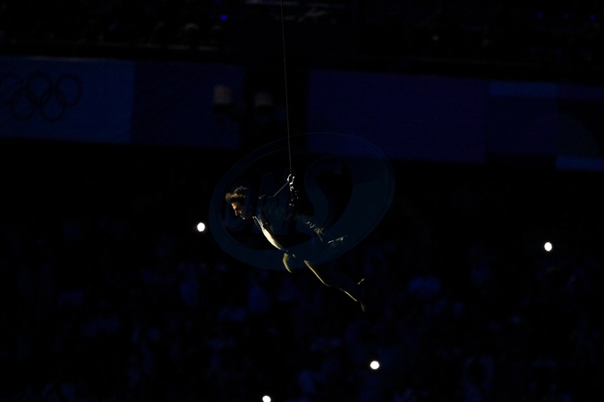 Tom Cruise, accroché à un fil, descend du toit du stade de France pour prendre le drapeau olympique des mains de l'athlète américaine, S.Biles, sous le regard de K.Bass, maire de Los Angeles, où se dérouleront les prochains jeux olympiques d'été en 2028 - Cérémonie de clôture des Jeux Olympiques de Paris 2024 au stade de France à Saint-Denis, le 11 août 2024. 270 artistes, 8200 athlètes et accompagnants issus de 205 délégations se succèdent dans le stade, devant 72.0000 spectateurs, avec la cycliste française P.Ferrand-Prévot et le joueur de rugby français, A.Dupont comme porte-drapeau pour la France. Comme pour la cérémonie d'ouverture, la direction artistique de cet événement est signée, T.Jolly. Au programme de cette soirée, cérémonie des médailles, discours et extinction de la flamme olympique, le show artistique baptisé «Records», les groupes Air et Phoenix pour la partie musicale tandis que l'acteur américain T.Cruise participe à cet événement. K.Bass, maire de Los Angeles, reçoit le drapeau olympique des mains de la maire de Paris, A.Hidalgo, quatre ans avant les prochains Jeux Olympiques d'été dans la cité des anges. © Jacovides-Perusseau / Bestimage Closing ceremony of the Paris 2024 Olympic Games at the Stade de France in Saint-Denis, on August 11, 2024. 270 artists, 8,200 athletes and accompanying persons from 205 delegations took turn in the stadium, with French cyclist P. Ferrand-Prévot and French rugby player A. Dupont as flag bearers for France. As for the opening ceremony, the artistic direction of this event is signed by T. Jolly. On the program for this evening, medal ceremony, speeches and extinguishing of the Olympic flame, the artistic show called "Records", the groups Air and Phoenix for the musical part while the American actor T. Cruise participates in this event. K. Bass, mayor of Los Angeles, receives the Olympic flag from the hands of the mayor of Paris, A. Hidalgo, four years before the next Summer Olympic Games in the city of angels.