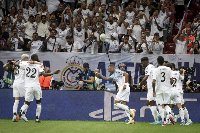 Joie des joueurs de Real Madrid apres le but de 9 KYLIAN MBAPPE (RM) - Match de football "Real Madrid vs Atlanta" lors de la Supercoupe de l'UEFA. Le 14 août 2024 © Elyxandro CEGARRA / Panoramic / Bestimage
