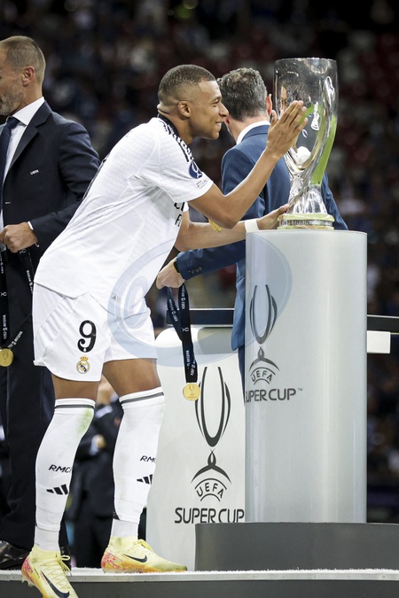 9 KYLIAN MBAPPE (RM) Real Madrid celebrate victory after the UEFA Super Cup 2024 - Match de football "Real Madrid vs Atlanta" lors de la Supercoupe de l'UEFA. Le 14 août 2024 © Elyxandro CEGARRA / Panoramic / Bestimage