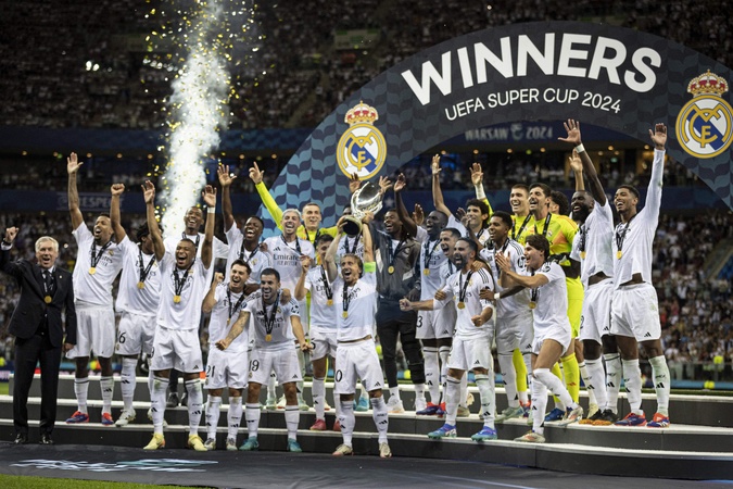 Real Madrid celebrate victory after the UEFA Super Cup 2024 - Match de football "Real Madrid vs Atlanta" lors de la Supercoupe de l'UEFA. Le 14 août 2024 © Elyxandro CEGARRA / Panoramic / Bestimage