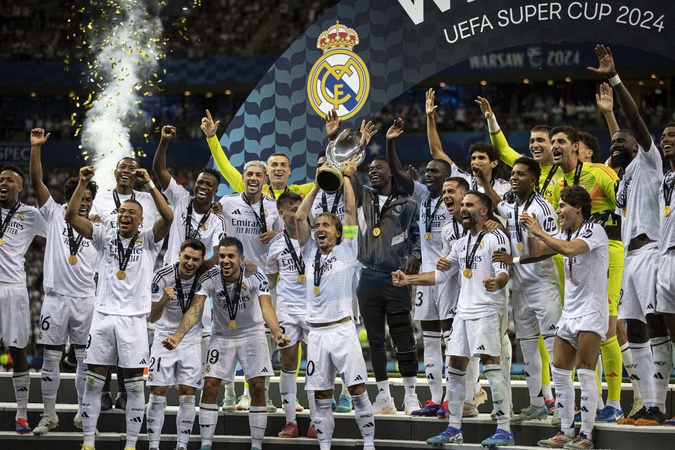 Real Madrid celebrate victory after the UEFA Super Cup 2024 - Match de football "Real Madrid vs Atlanta" lors de la Supercoupe de l'UEFA. Le 14 août 2024 © Elyxandro CEGARRA / Panoramic / Bestimage