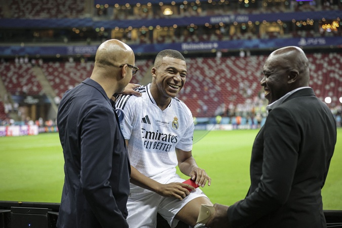 9 KYLIAN MBAPPE (RM) and wilfried mbappe Real Madrid celebrate victory after the UEFA Super Cup 2024 - Match de football "Real Madrid vs Atlanta" lors de la Supercoupe de l'UEFA. Le 14 août 2024 © Elyxandro CEGARRA / Panoramic / Bestimage